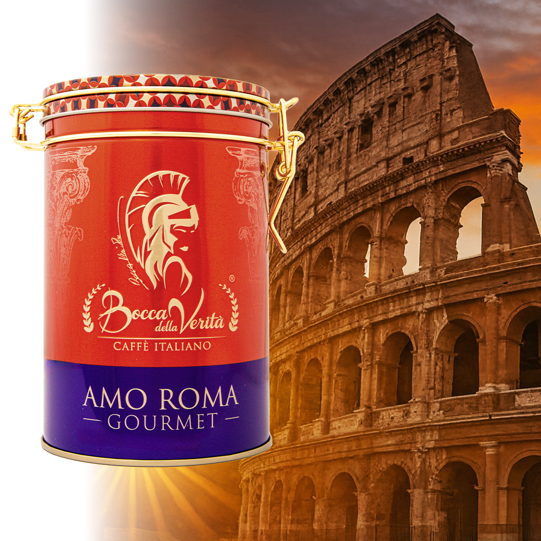 Bocca della Verità te trae "AMO ROMA®" Gourmet, una mezcla creada para enamorar a los amantes del café que buscan lo mejor de ambos mundos: la fuerza y el carácter de la robusta, y la elegancia y suavidad de la arábica. Esta mezcla premium combina granos seleccionados de los orígenes más prestigiosos: Brasil, Etiopía, India y Vietnam.